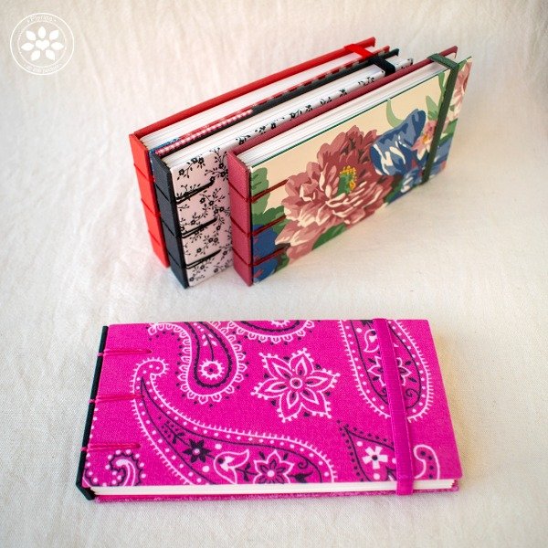 En el taller quedan cortes de telas, papeles y cartones que guardo para usar en algún proyecto. Este año, para hacer espacio y renovar, comencé a usar todos esos materiales. Estas libretas están hechas con esos tesoritos que fui guardando en todos estos años.